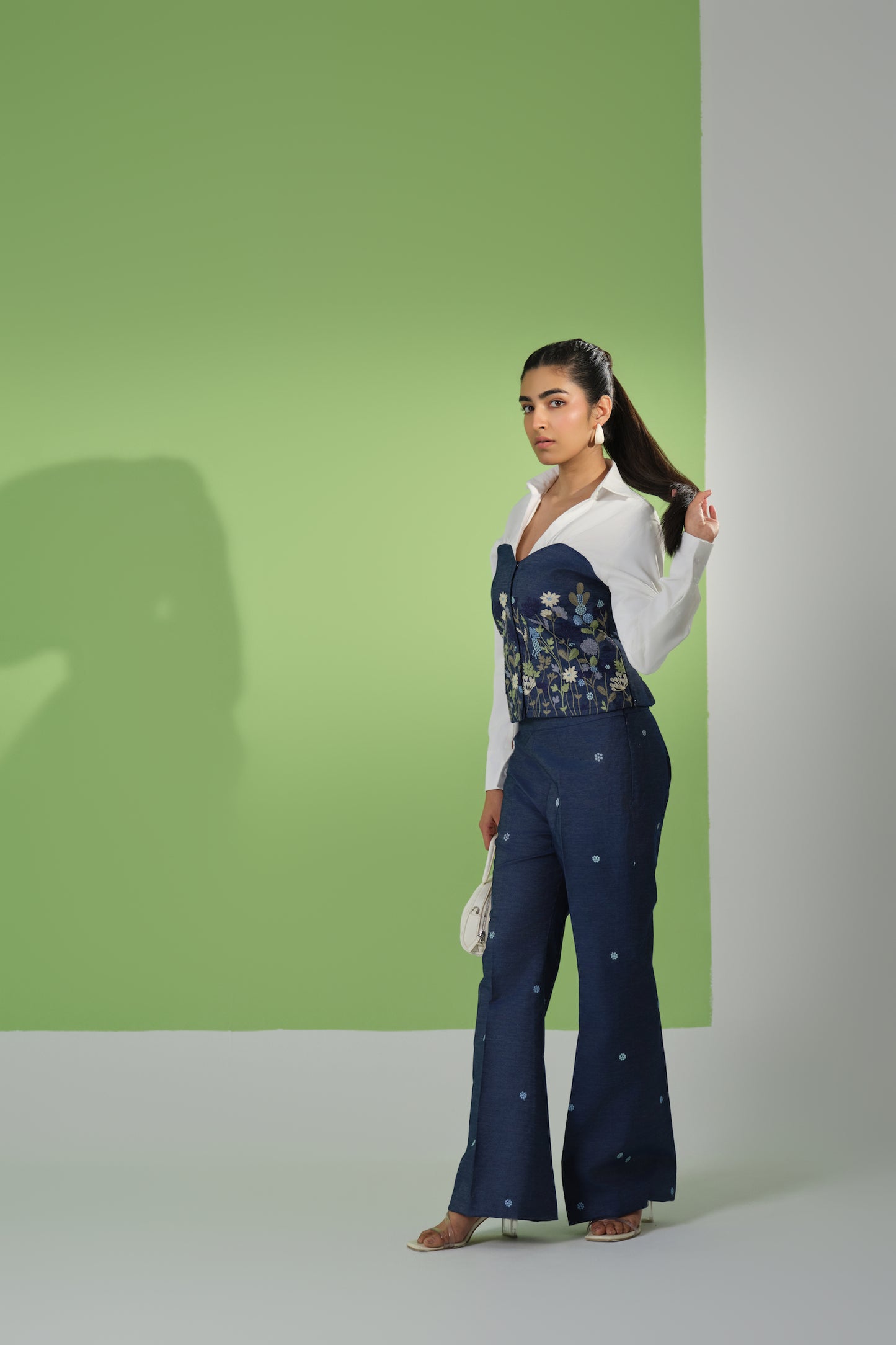A perfect fusion of classic sophistication and modern femininity, the Denim Bloom Corset Co-Ord Set is designed for the contemporary woman who loves to blend elegance with a bold fashion statement. Featuring a structured corset-style top with delicate floral embroidery, this set redefines power dressing with a fresh and refined twist. The contrast of crisp white sleeves against deep indigo denim creates a striking visual appeal, making it ideal for both formal and semi-casual occasions.